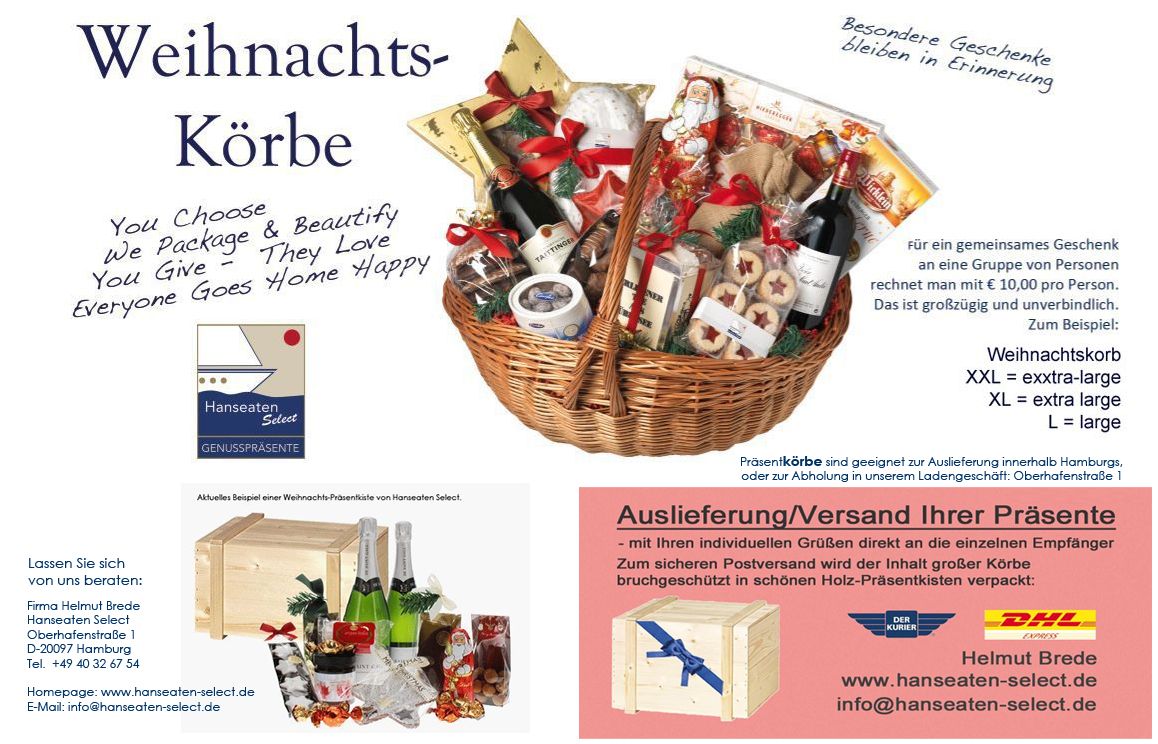 Wir liefern individuelle Weihnachtskörbe. Unsere Mitarbeiter beraten Sie gerne zu den Möglichkeiten der individuellen Zusammenstellung Ihrer Körbe und zu den möglichen Versandoptionen. Natürlich senden wir Ihre Präsente auch direkt an die einzelnen Empfänger. Kontaktieren Sie uns: Telefon: 040-32 67 54 und E-Mail: info@hanseaten-select.de.